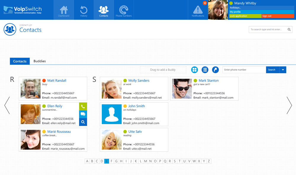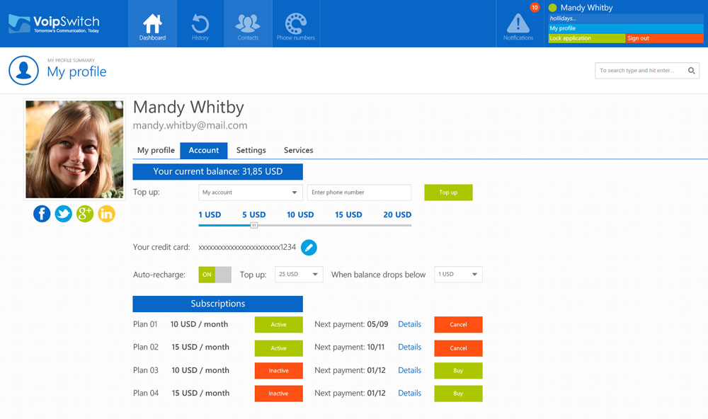 The VoipSwitch User Portal (VUP) is an Html5 based lightweight customer self-care web interface. It works on PC, tablets and smartphones.Its purpose is to provide a service center where customers can manage their account settings, review billing information and add new services. VUP also allows for direct use of communication services such as Instant Messaging and voice/video calling.